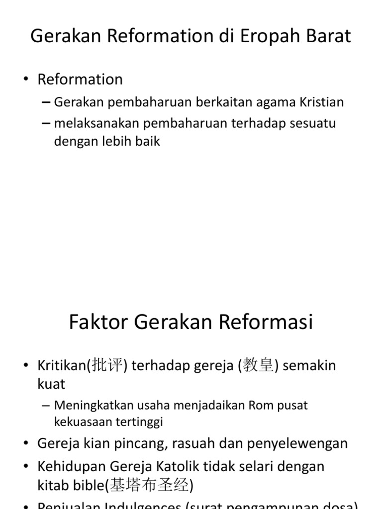 Penjualan Indulgences dan larangan membaca orang awam membaca kitab Bible telah ditentang oleh Martin Luther. 13 Istilah al-Sahihayn merupakan ungkapan yang digunakan untuk dua buah kitab hadith iaitu kitab. Gaya hidup penguasa gereja tidak selari dengan anjuran kitab Bible.